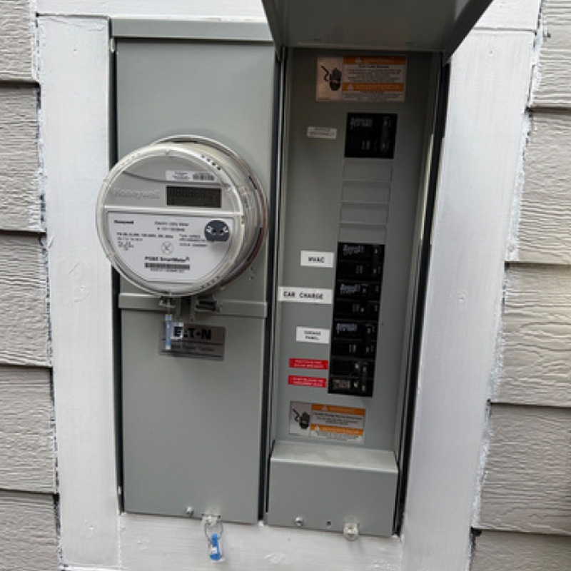 - Close-up with the door open, showing all the breakers.