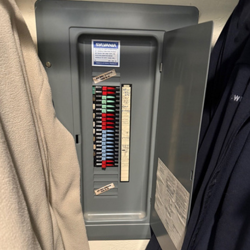 1. Close-up with the door open, showing all the breakers.
